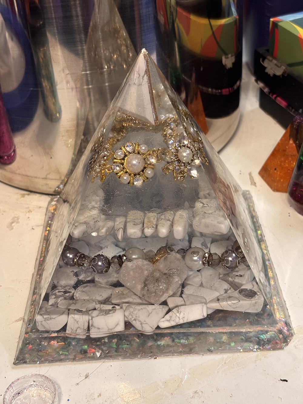 Heart of Tranquility – Orgonite Pyramid for Peace, Healing & Balance This handmade orgonite pyramid is a sanctuary of calm, balance, and higher healing. Infused with white howlite, quartz, and a centerpiece heart, it radiates gentle yet powerful energy to soothe stress, ease emotions, and open the heart to unconditional love. 🔮 Key Features - Quartz Crystal Heart – The centerpiece of love, clarity, and amplified intention. - Howlite Stones – Known as the stone of peace, howlite calms racing thoughts, eases stress, and encourages patience and emotional balance. - Howlite Triangle at the Apex – Enhances spiritual connection while anchoring the energy of tranquility. - Pearl & Gold Accents – Symbolize purity, wisdom, and divine feminine energy. - Copper Energy Flow – Subtle copper inclusions enhance energy circulation and grounding. 💎 Energy Benefits - Promotes emotional healing and calm during stressful times. - Encourages restful sleep and relaxation. - Helps quiet the mind for meditation or spiritual practice. - Balances heart and crown chakras for higher guidance and inner peace. 🌌 Purpose & Placement Place this pyramid on your nightstand, meditation altar, or healing space to invite peace and clarity into your environment. Its elegant design also makes it a unique, meaningful gift for those seeking balance and calm.