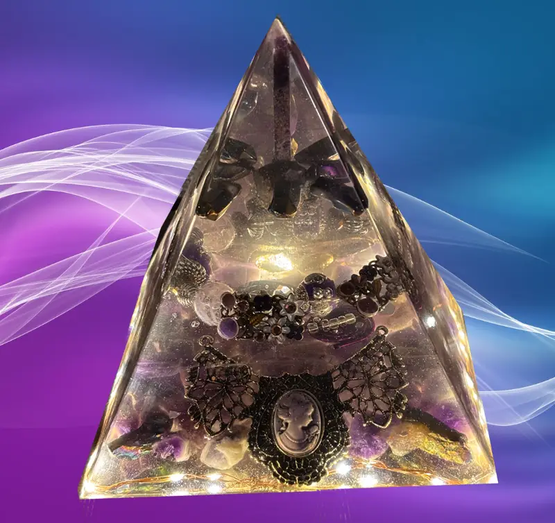 This elegant orgonite pyramid carries the energy of inner knowing, intuition, and feminine wisdom.